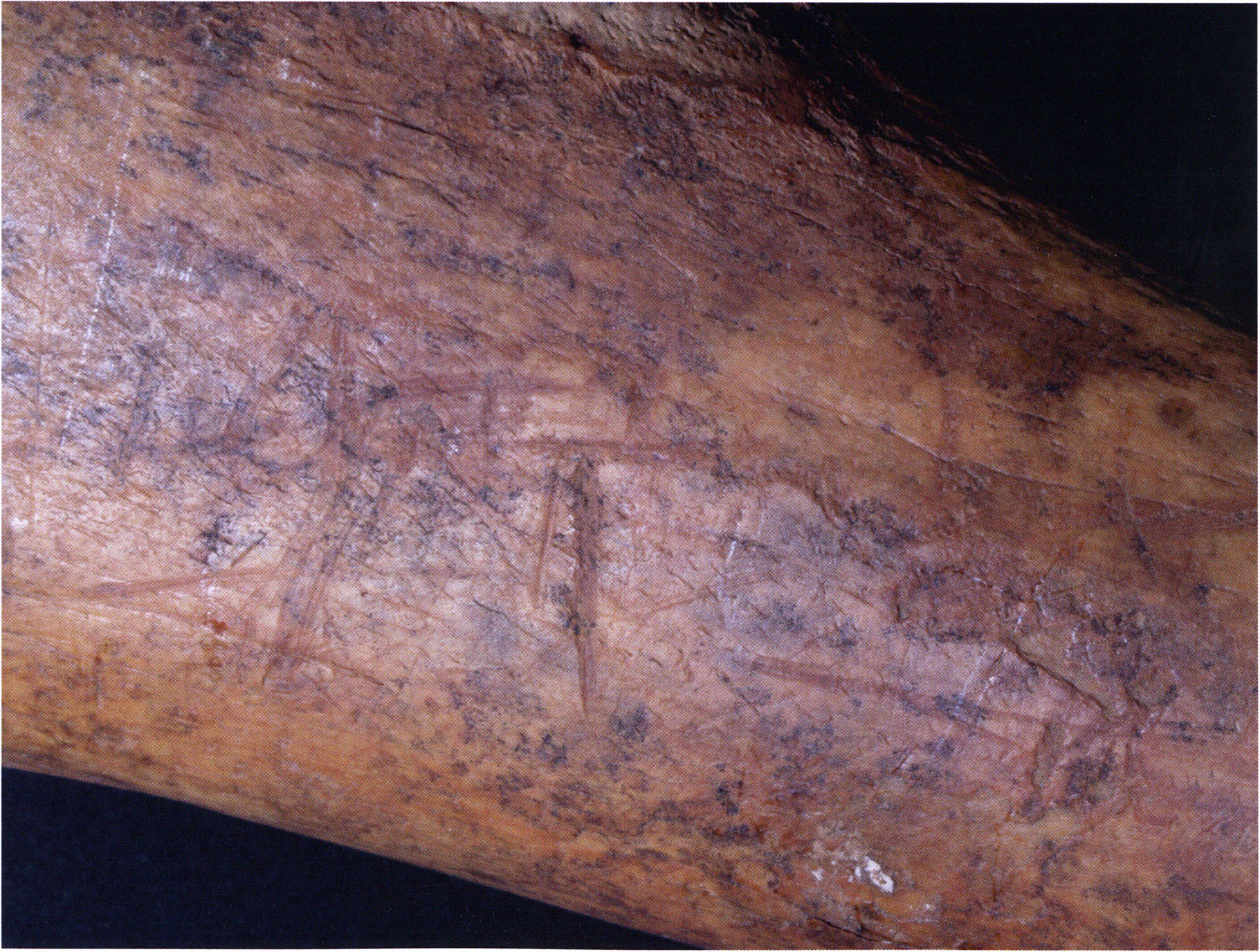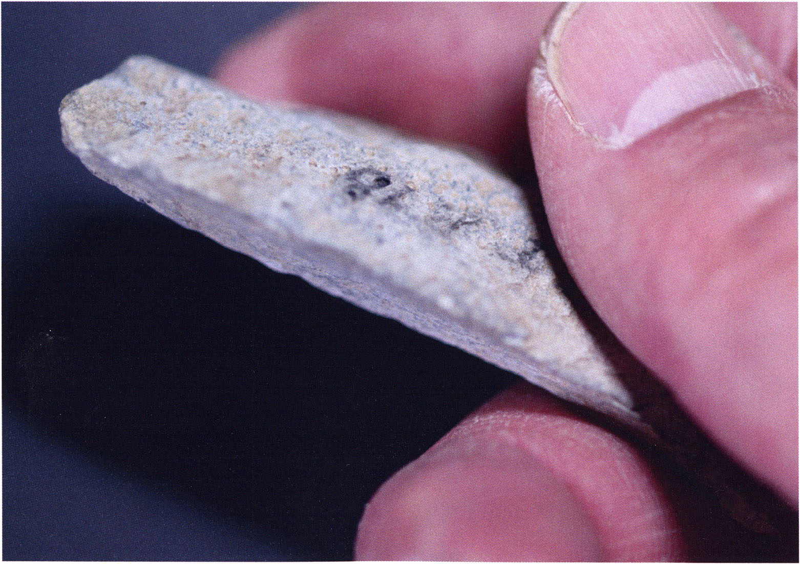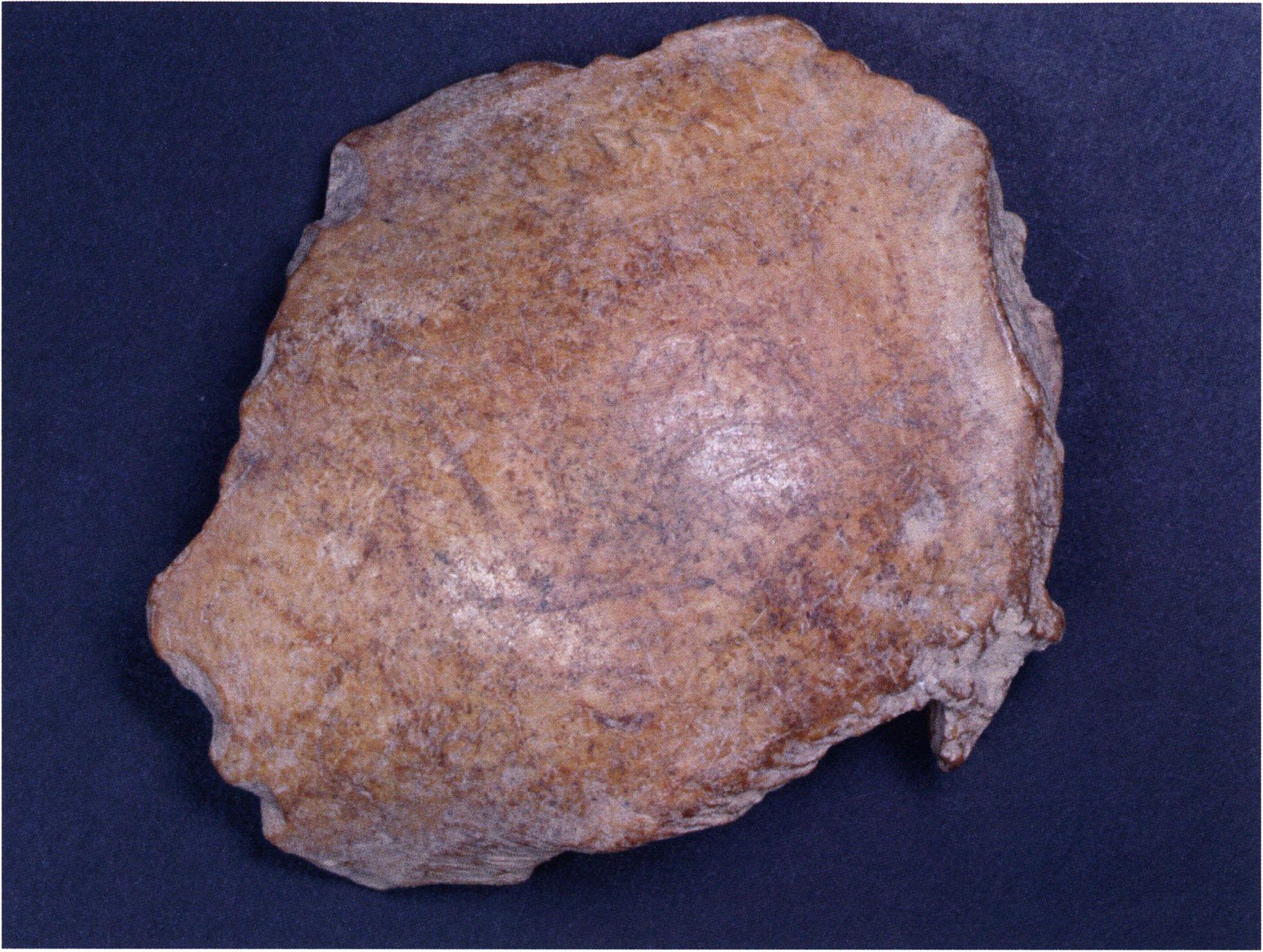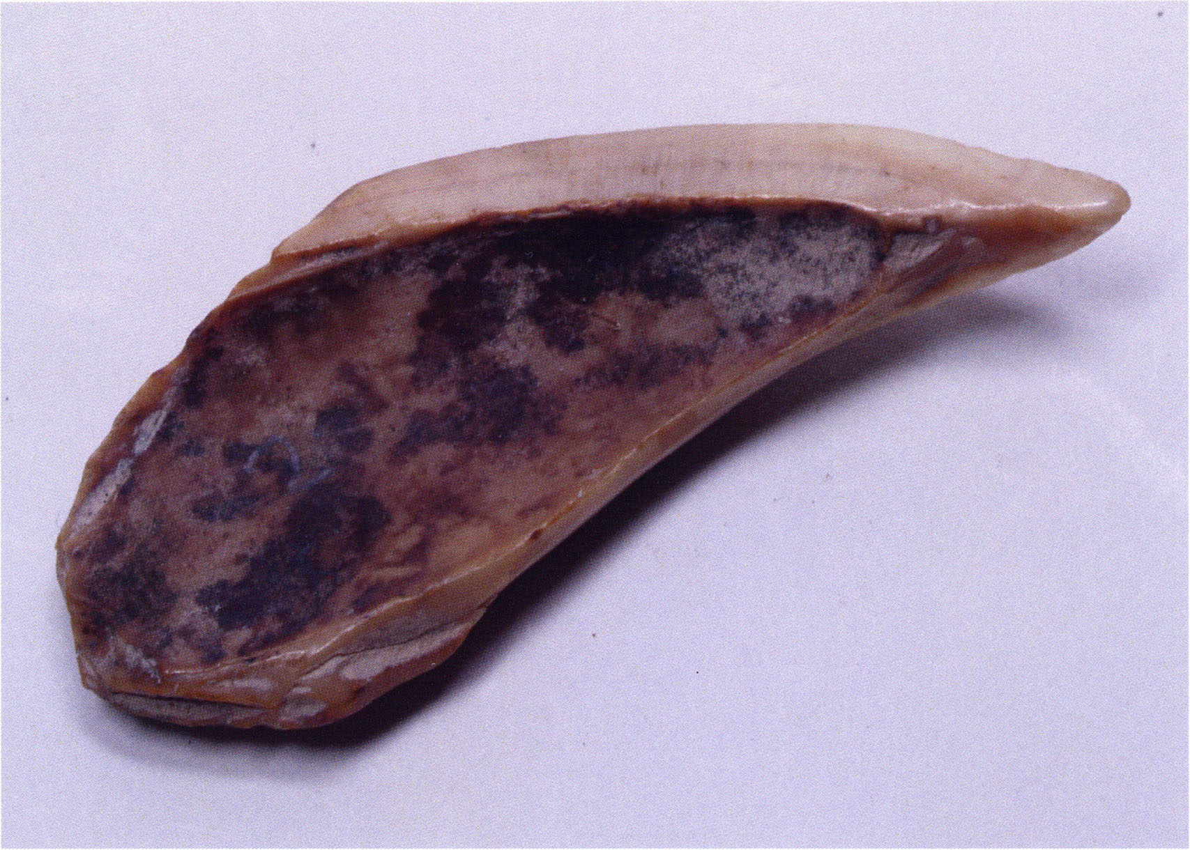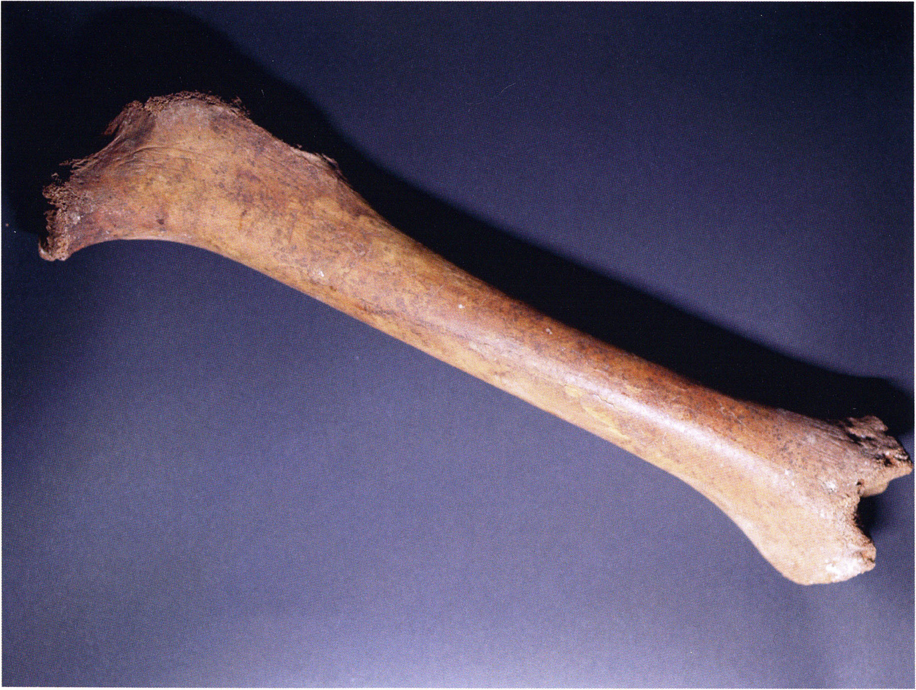 Figs. 173 a–c, pp. 371 f.: 89 mm long rib fragment with polished flute-beak fracture at one of the two fracture sites, numerous fine scratch marks on the outer surface from working, and the inscription "H III section 9, 1 m right." — This inscription is partially somewhat faded — notably the "r" — visible only upon closer inspection — not "l"! — of "right" (of the axis). For this stated location Nigg records in 1923, p. 27, as accompaniment of a third skull depot in the 9th section metre of H III, 1st m right of the axis, in the 2nd layer resting immediately on the 3rd layer: "a suspicious rib piece"! We can be almost certain that the photographed piece is this "suspicious rib piece"! — (a) Outer surface. (b) Outer surface of the polished flute-beak fracture end. (c) Inner surface.