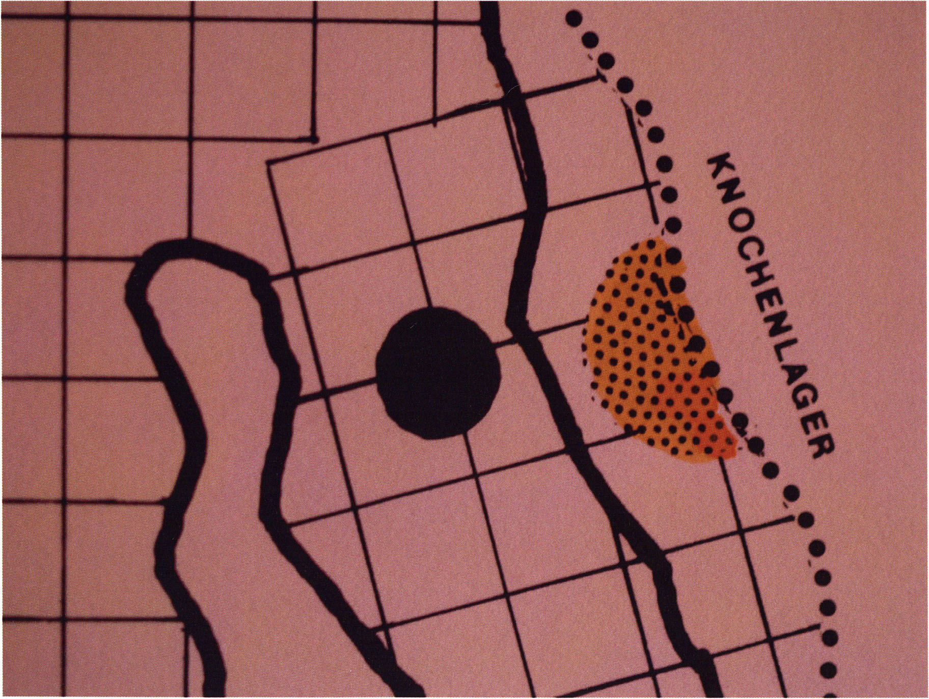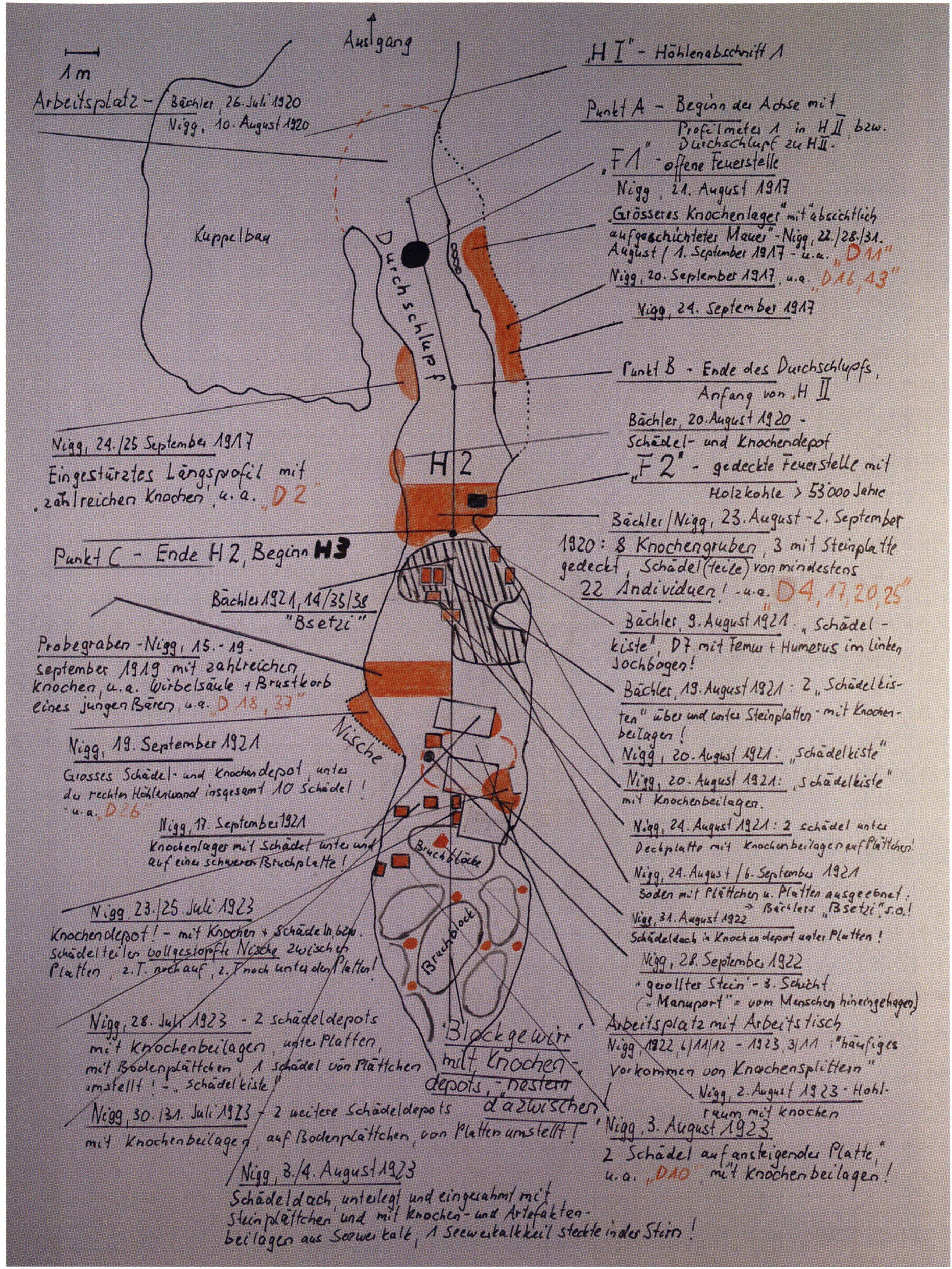 Plan legend, Larger deposits of cave bear bones created by Neanderthal man and recorded by the excavators Nigg and Bächler — and special depots of cave bear skulls with bone accompaniments — entered schematically in orange in the same cave floor plan as p. 412. — Alongside these, in black hatching, the " Bsetzi-Boden"(see Chronicle); encircled with dashed orange lines: 2 sites with high bone-splinter concentrations; in black: the round hearth F 1 and the rectangular F 2; and in schematic outline: larger broken slabs and collapse blocks. For H 2 / H 3 cf. the plan in Fig. 120, p. 255!