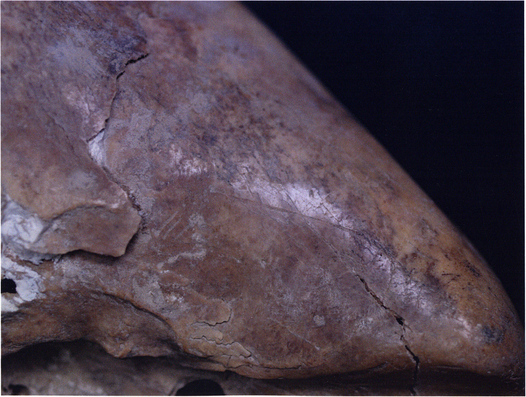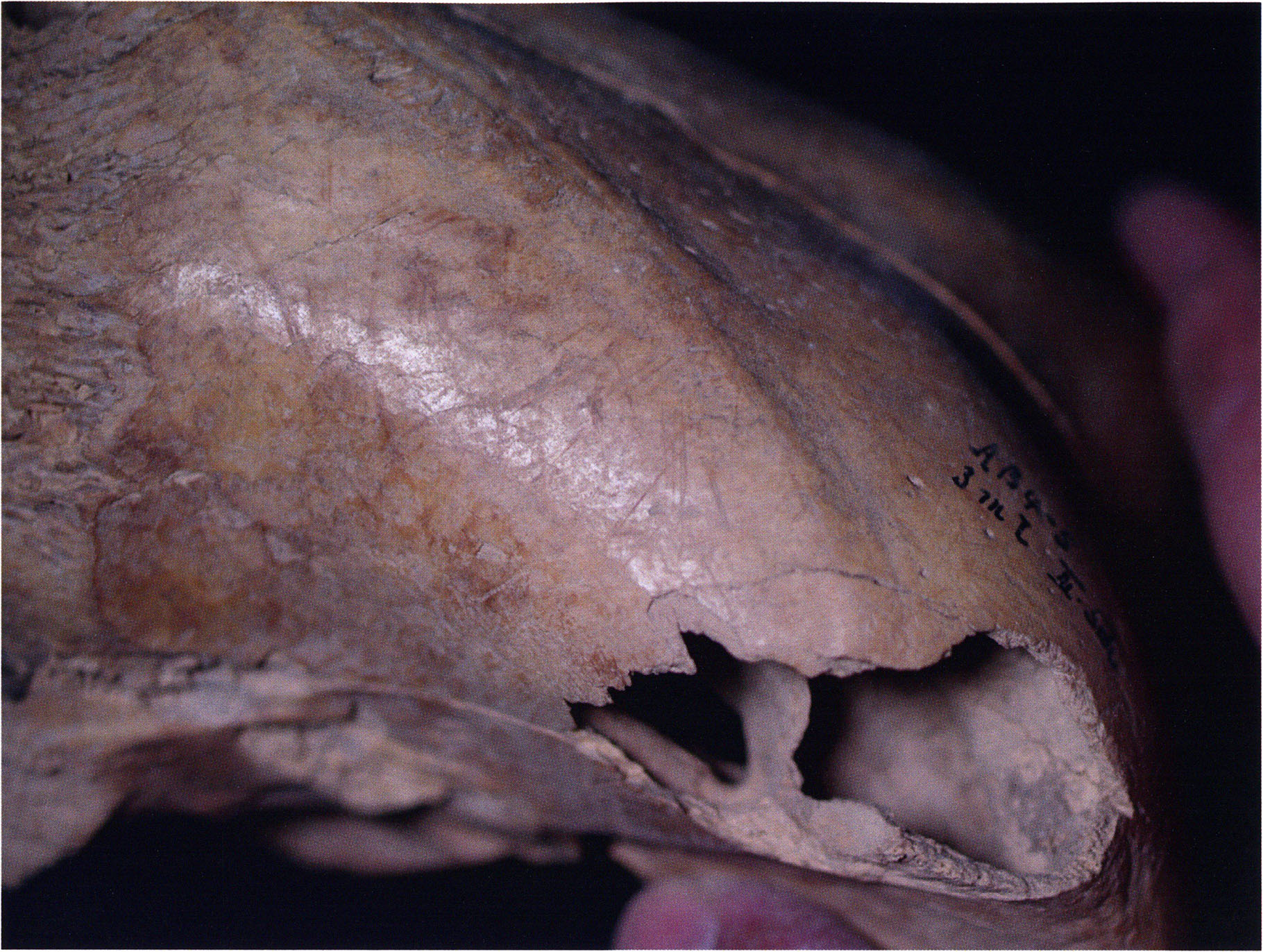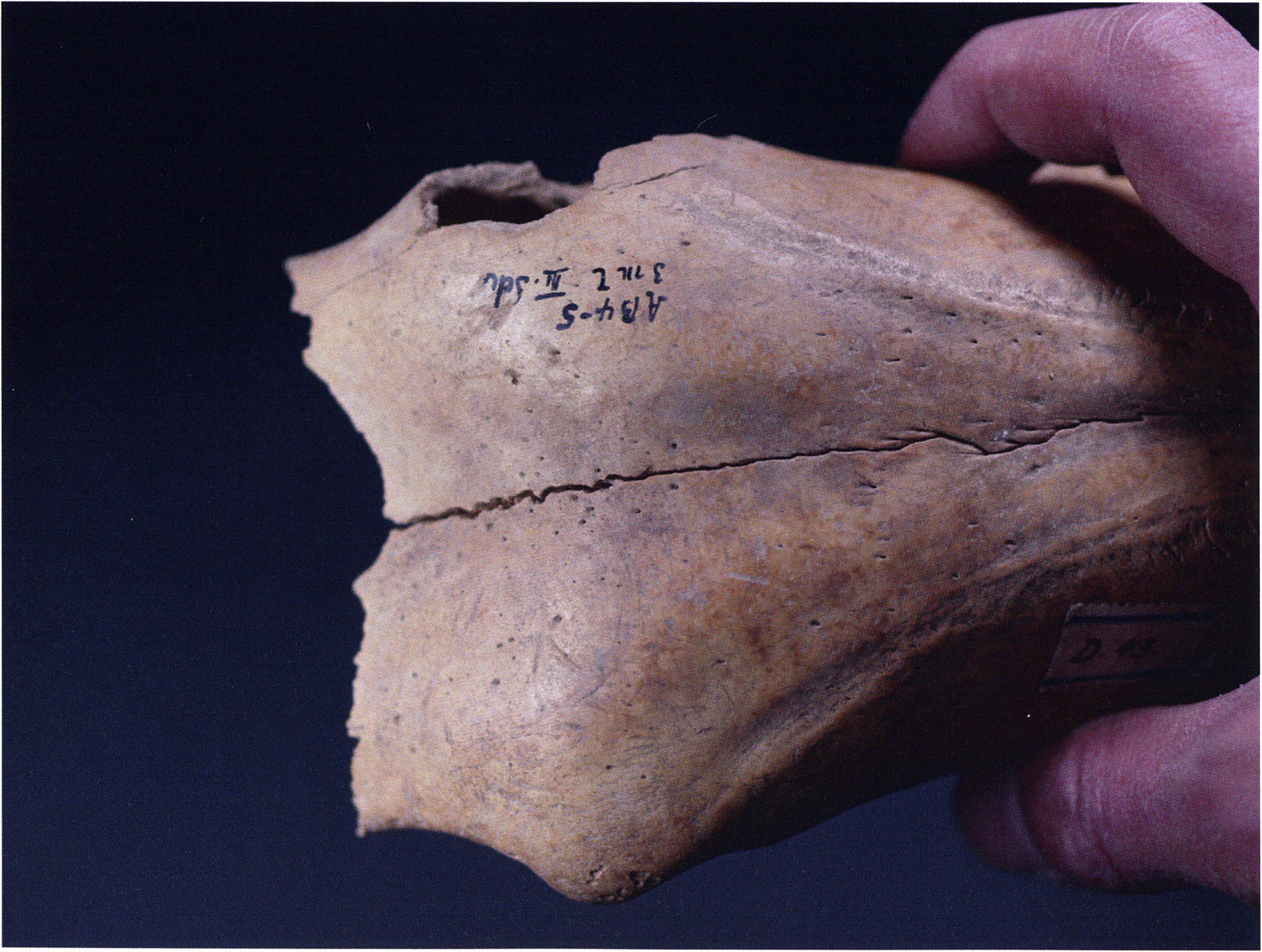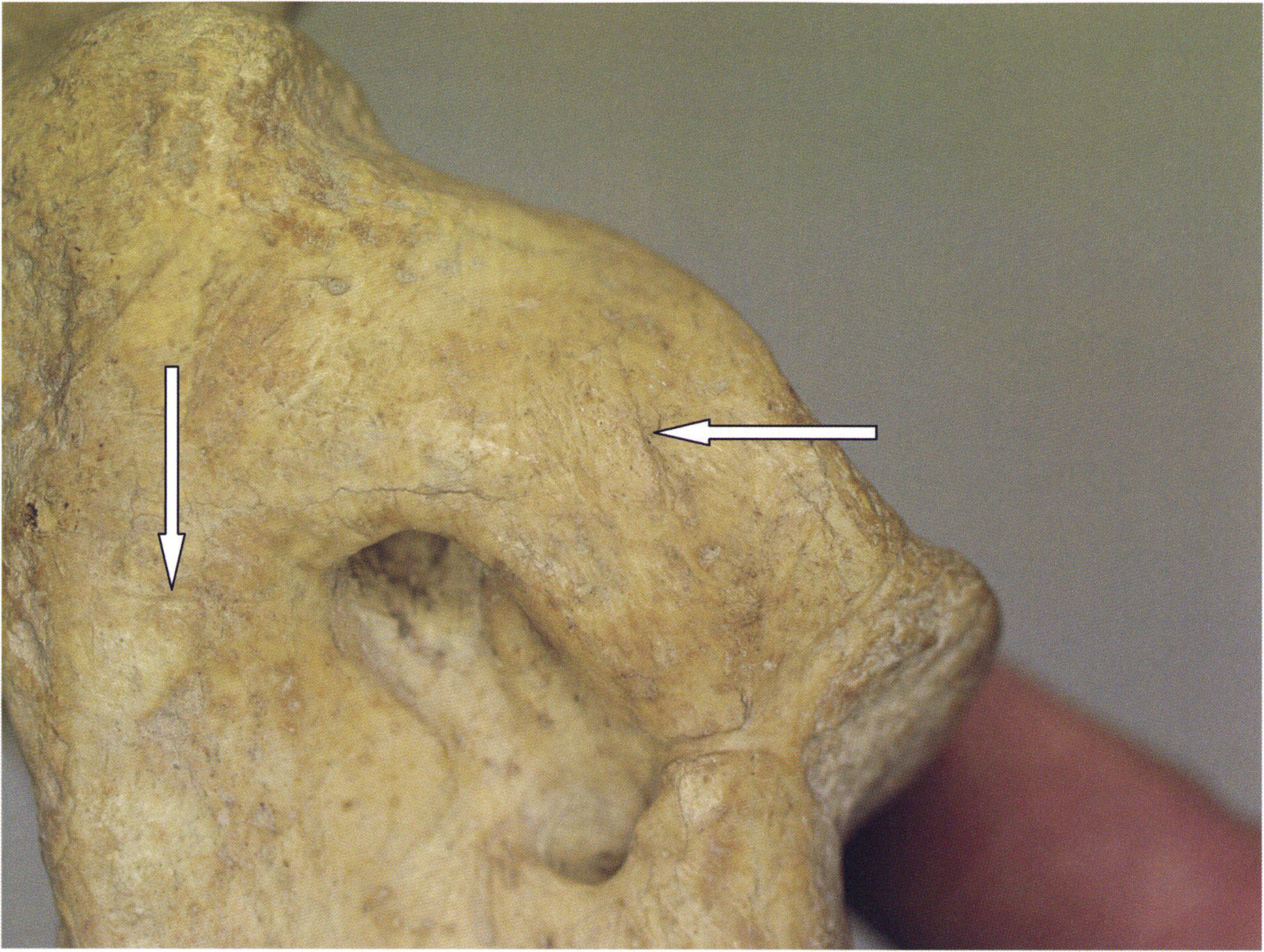 (d) Right side with hole in the skull roof. (e) Unambiguous cut marks.