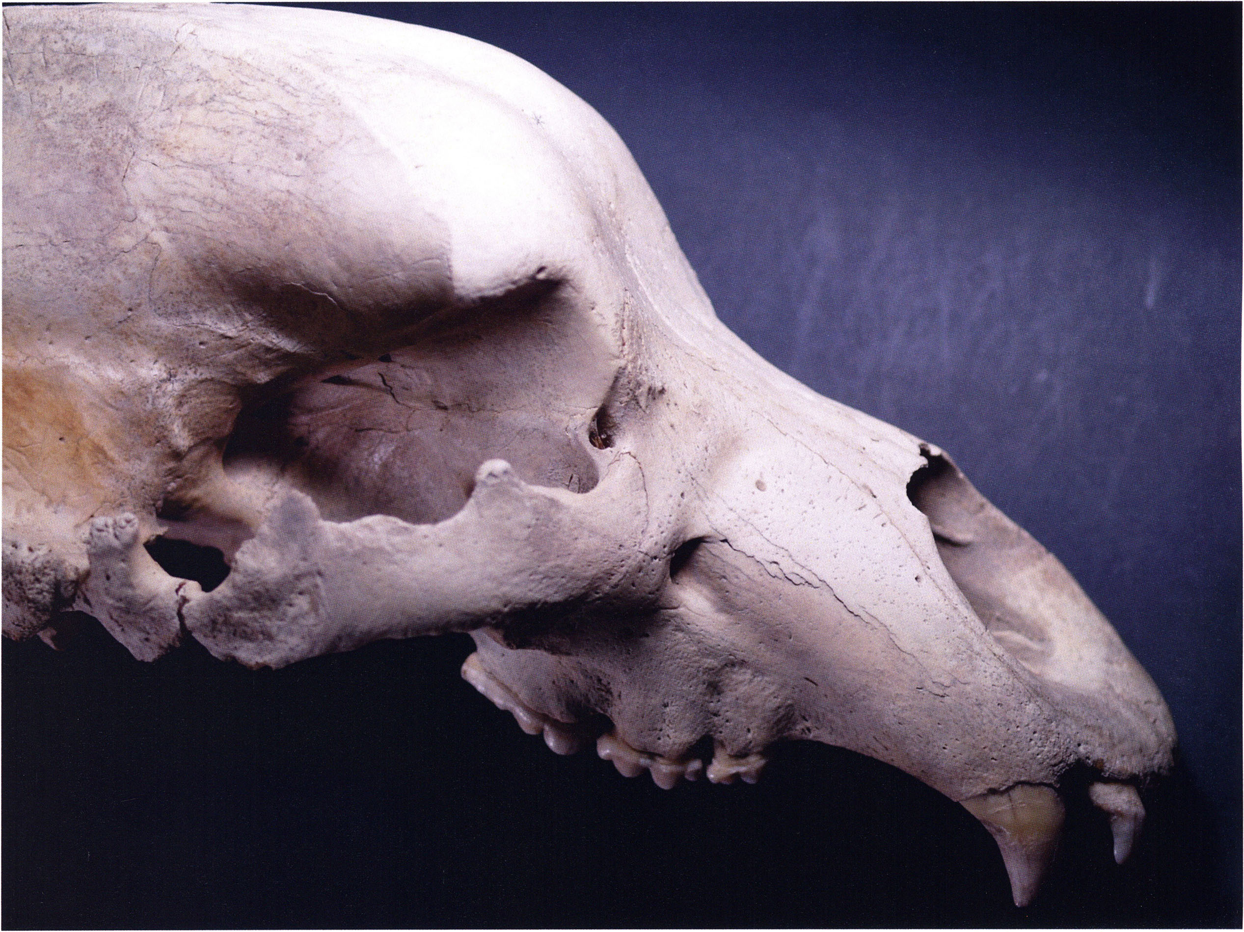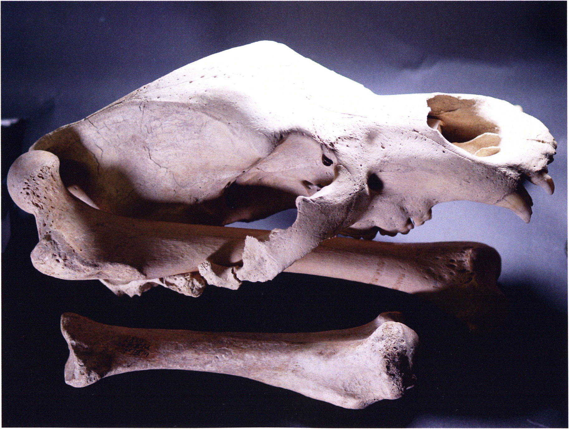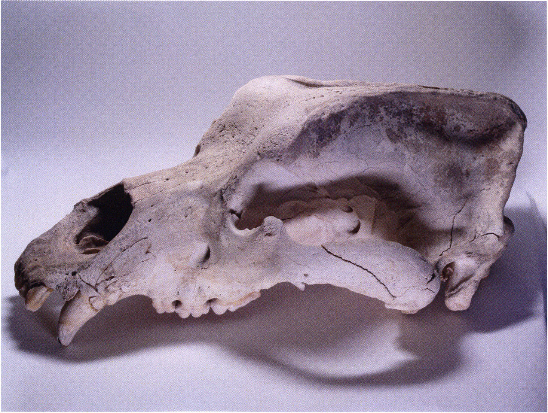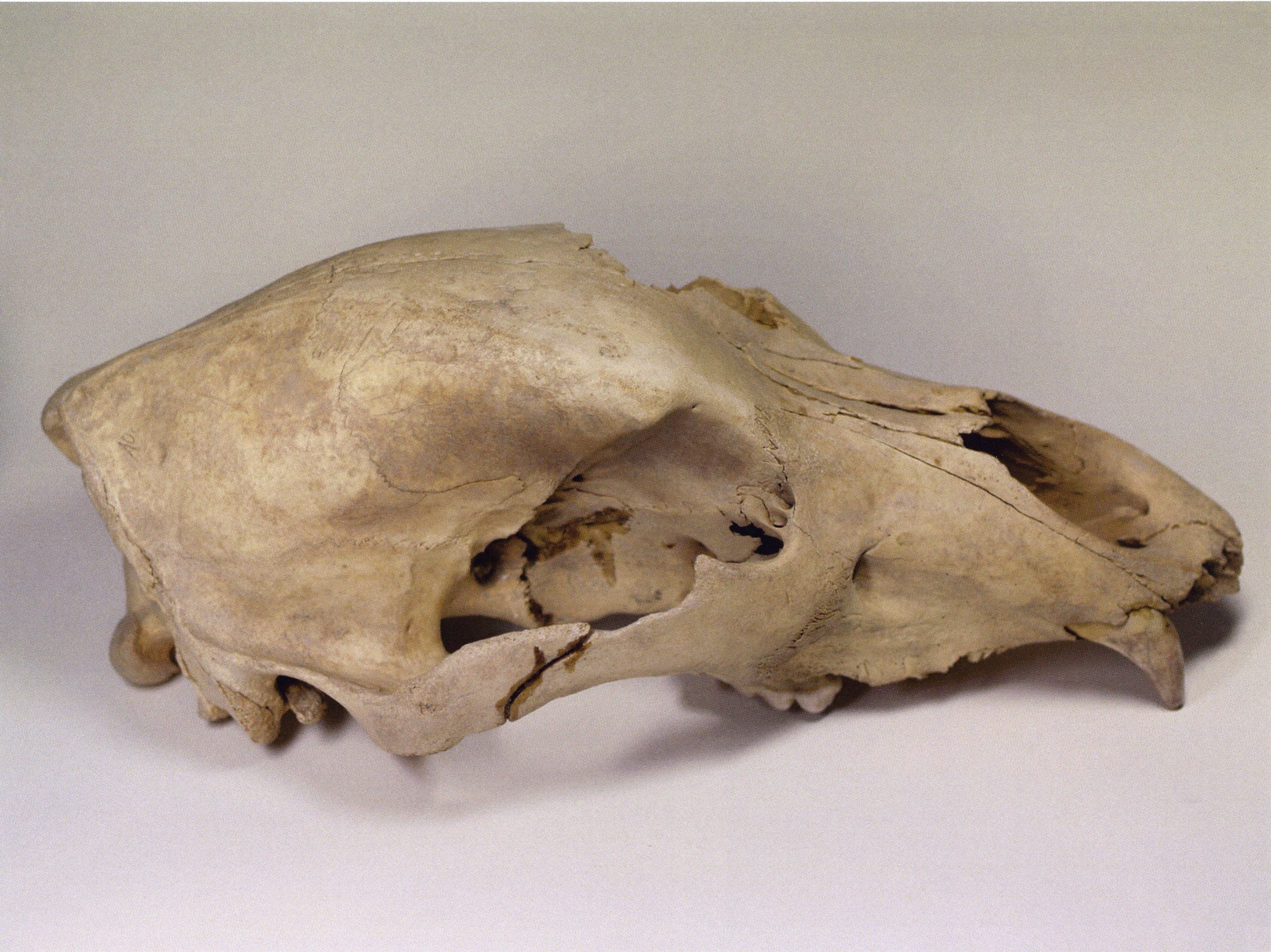 (a) Muzzle with forehead from the upper left, with the mutilated canine. (b) Left side. (c) Underside — upper jaw: Heinz Bächler assigns D 20 — according to the preserved molars — to age class I b: "no trace of wear" — thus classing the animal as slightly younger than that of D 17: ¾ to 1½ years! — D 20 like D 17 also a young animal — of a size most frequently hunted by the Neanderthal bear hunters of the Drachenloch.