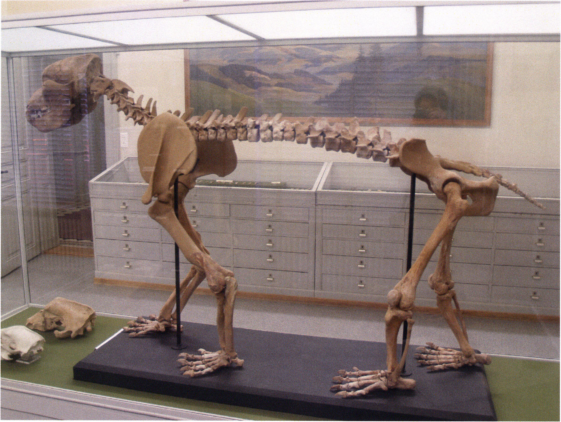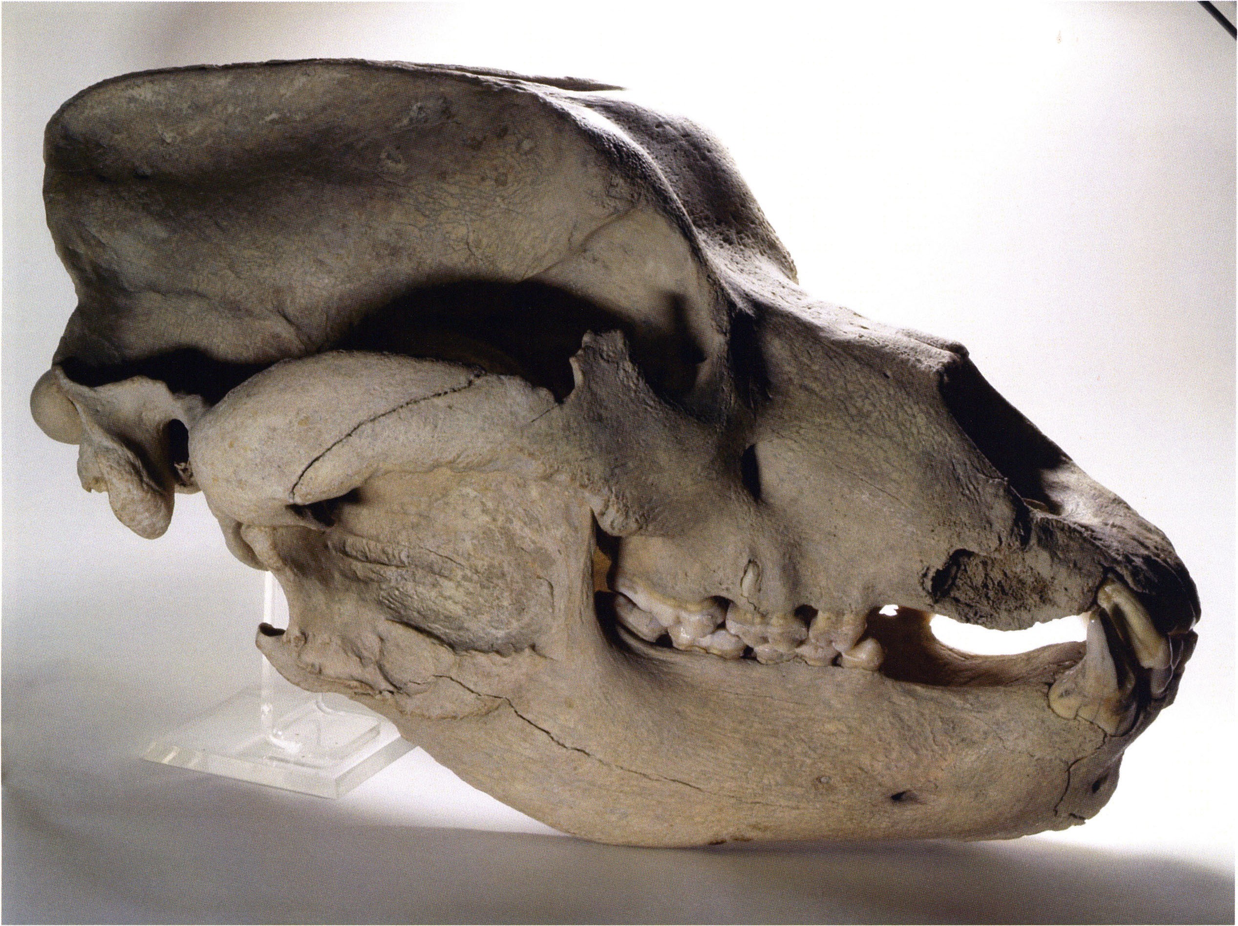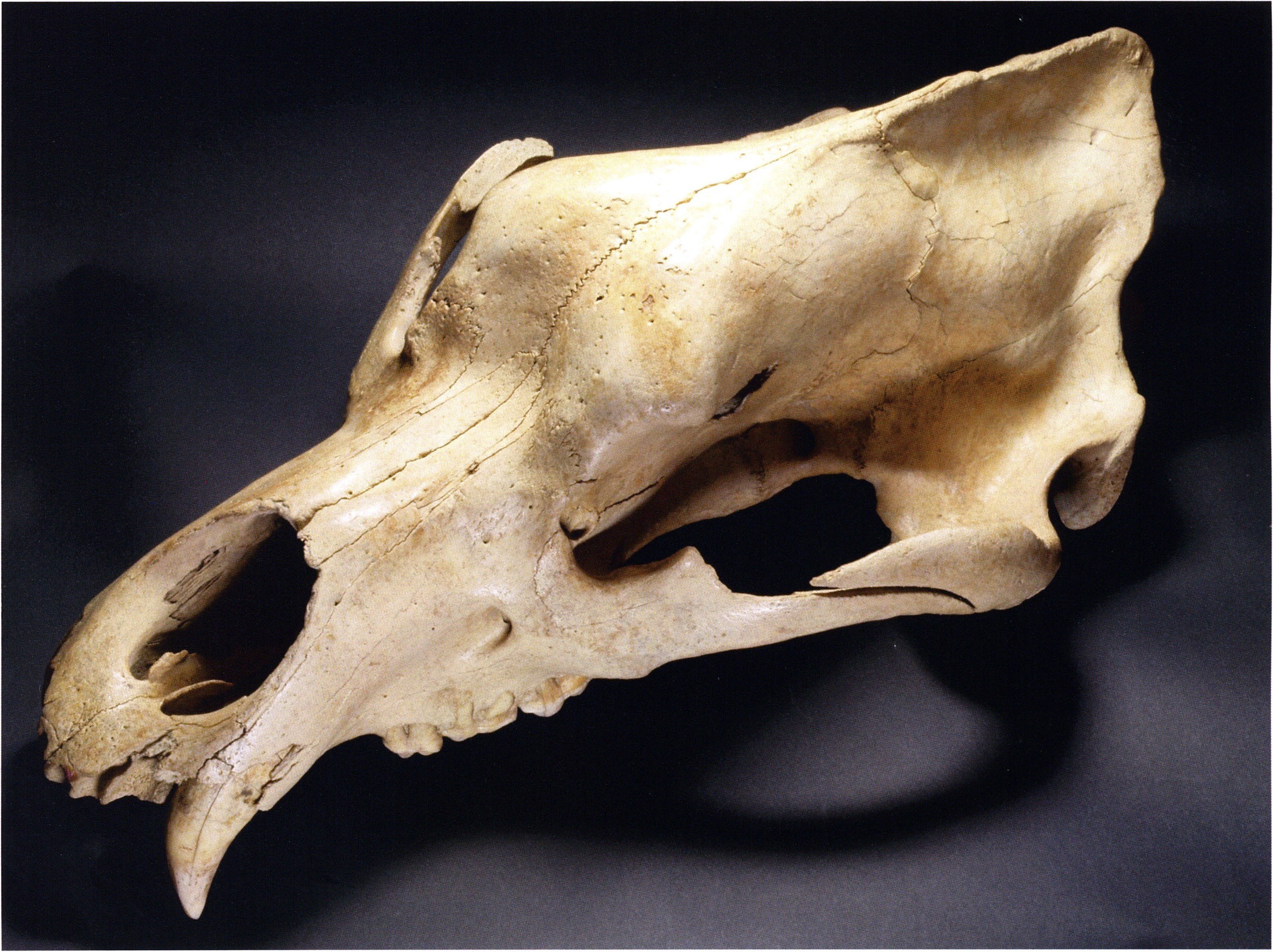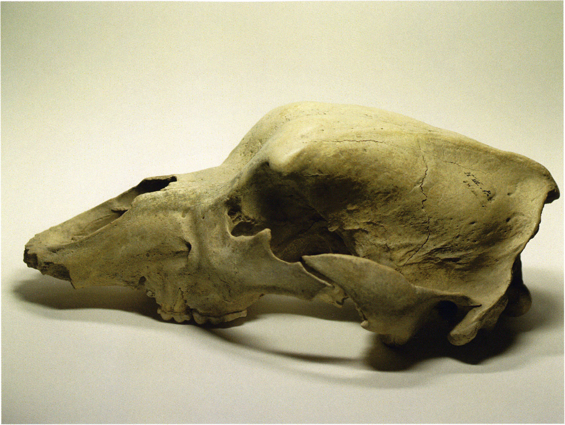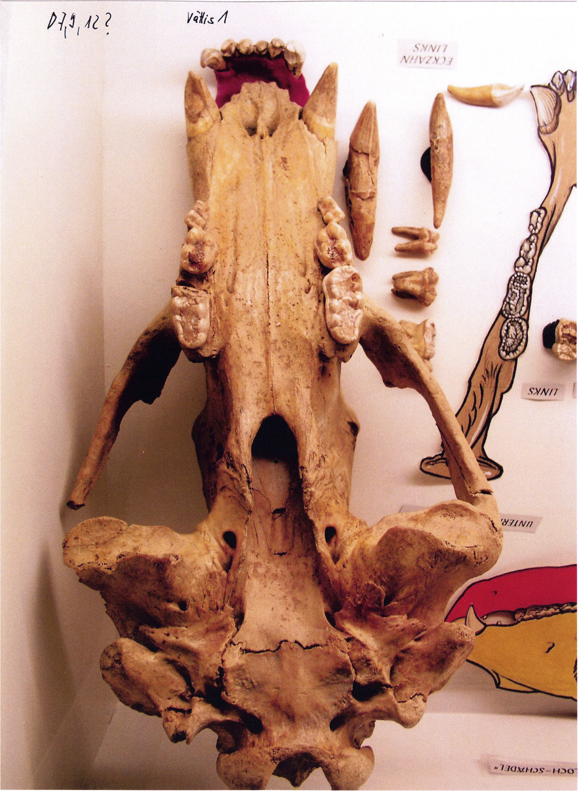 Heinz Bächler describes it on the cited sheet as a "very juvenile and very small skull" and assigns it to the very first age class I a: "molars without any trace of wear," ¾ to 1½ years old. (For palaeontologists: "sutura parieto-occipitalis still traceable above the sagittal crest — the suture between the skull parts above the crown!") — Its profile length he measures as 318 mm. (Bächler 1940, pp. 191 f.)