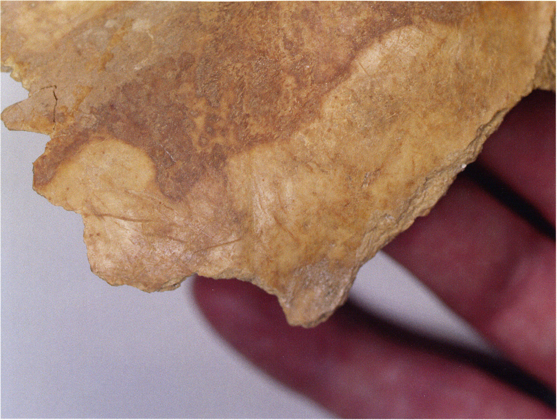 Figs. 176 a/b, pp. 376 f.: The skull on the ascending slab sketched by Nigg from the 2nd m right of the 10th section metre is identical with "D 10" in the find depot! Not only does the accompanying slip of paper confirm the identity — with the details "H III section 10, 2nd m right — 3 August 1923" (see 176 a) — but also the left zygomatic arch stump recorded by Nigg and present in "D 10"! The latter is in this case decisive for identification, since during the inspection in the find depot a second slip was discovered in the nasal opening of the skull containing different details of provenance and find date: "H III section 9, m 1 left, 2nd layer, 28 July 1923"! — Nigg describes in the 10th section metre and 1st and 2nd m right "a hard-trodden, tenacious loam floor baked together with the very weakly developed surface layer" and described the shin bone found there as "firmly cemented in the hard-trodden loam." These floor conditions are quite evidently also reflected on the surface of our skull "D 10" — where a thin, greyish coating sticks fast like a cementing compound and thus unfortunately also covers all probably originally present cut marks! — Heinz Bächler assigns it to age class 2 a: 1½ to 2 years. The measured profile length of 397 mm accords with this.