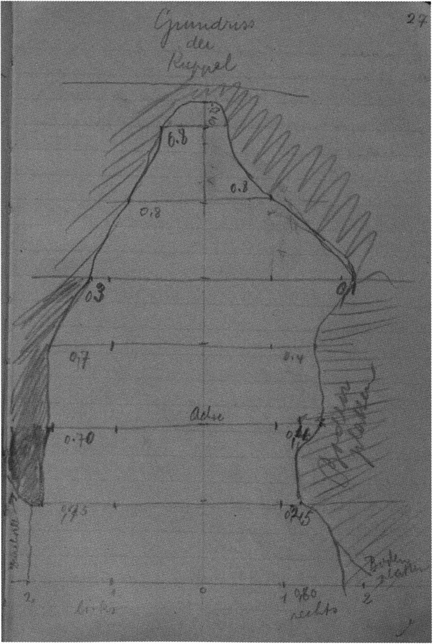 Fig. 141, p. 303: Nigg begins the 1921 work in Bächler's absence first in the dome structure, right of the passage H I / H II; "result = 0" he writes! His floor-plan sketch of 3 August — D V/6 sketchbook (S) I, p. 1.