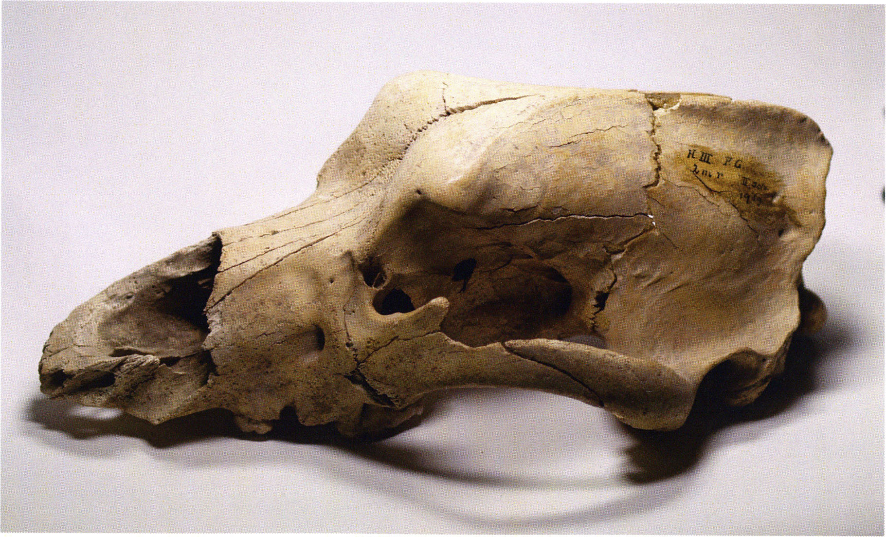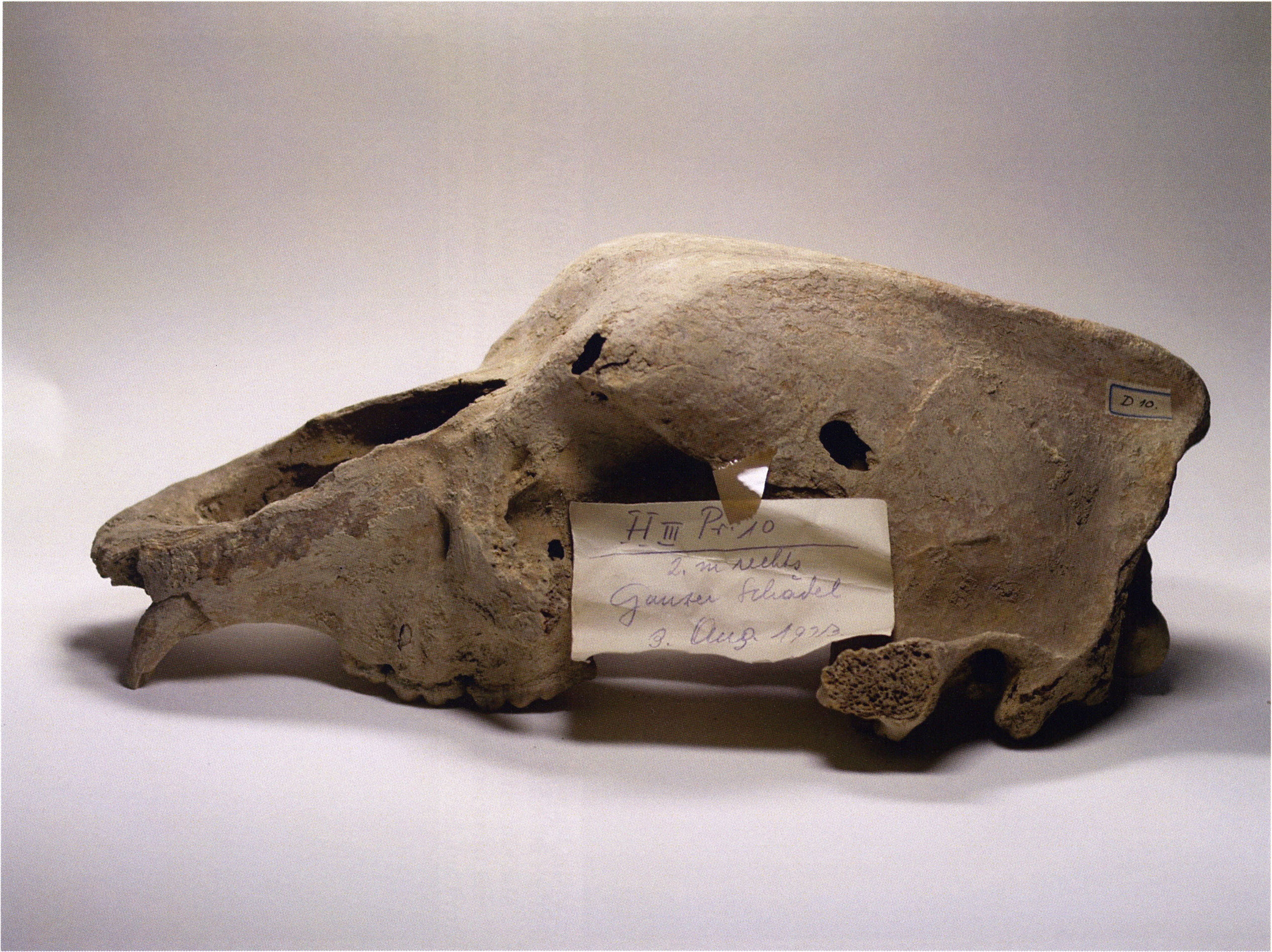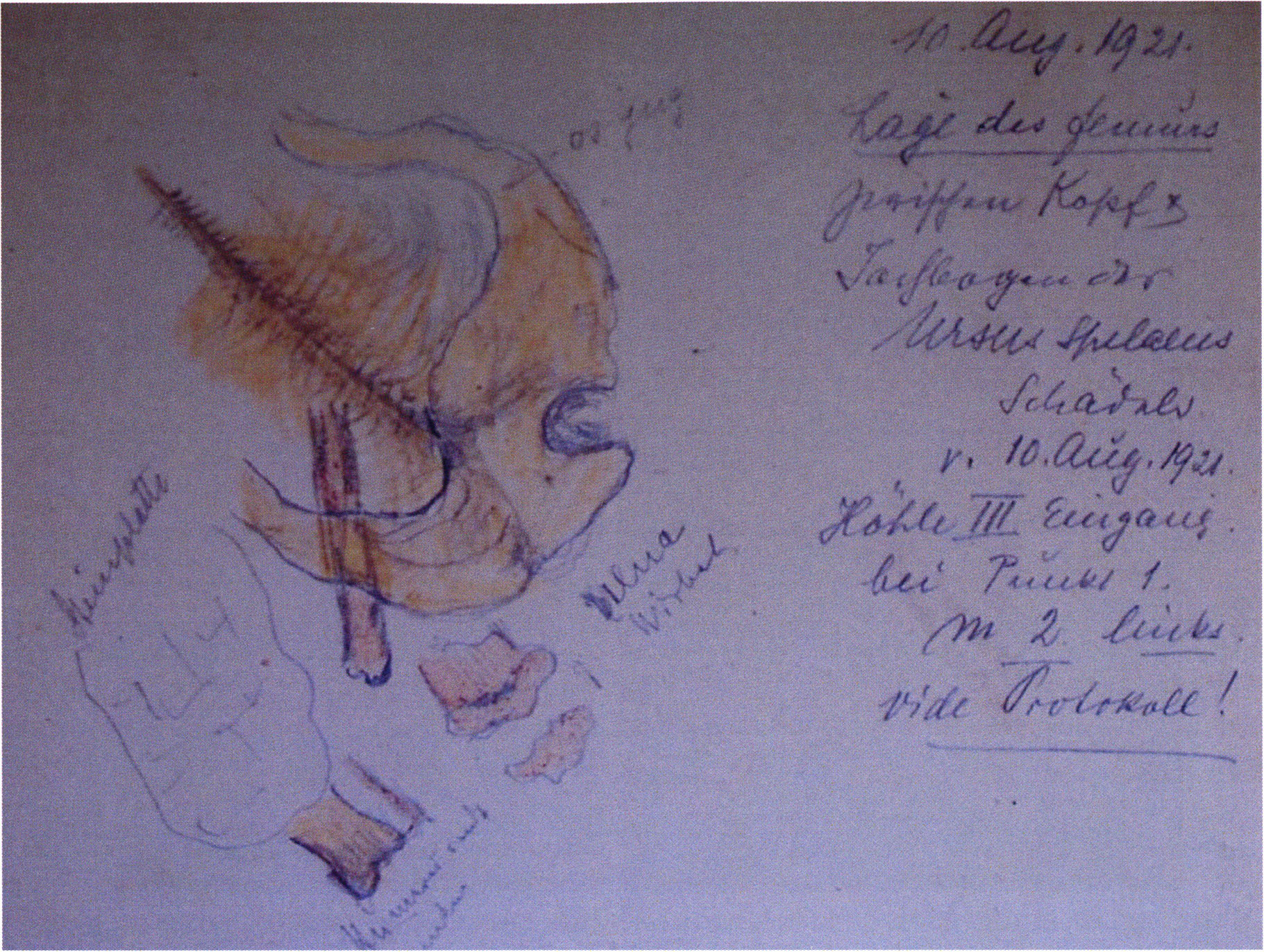 Figs. 157 a–c, pp. 329 f.: Repaired "smashed bear skull" from the receding right cave wall (= niche) in section metre 6 of H III — found on 16 September 1921 and forming — together with 10 further skulls — a larger skull depot — cf. plan and p. 412! — This skull belongs to a very young, not yet fully grown animal (completed profile length approximately 250 mm!); the preserved molars show as yet no traces of wear whatsoever: age class 1 a — over ¾ years! — a young victim of the Drachenloch hunters! — Moisture — perhaps even dripping water — has left visible traces: the bone was softened and broke at a later point into its individual parts; the skull seems before its smashing to have been lying on its left side — the right shows innumerable corrosion holes! — Under these circumstances the working or cut marks of the prehistoric hunter stemming from the defleshing that were originally probably present on the surface — as are customarily present on the Drachenloch cave bear skulls — are unfortunately no longer demonstrable on this skull! — The skull lies in the depot, bears the label "D 26," and is provided with a slip of paper: "H III section 6 skull from the niche of the right cave wall. 17. (correct: 16.) Sept. 1921."