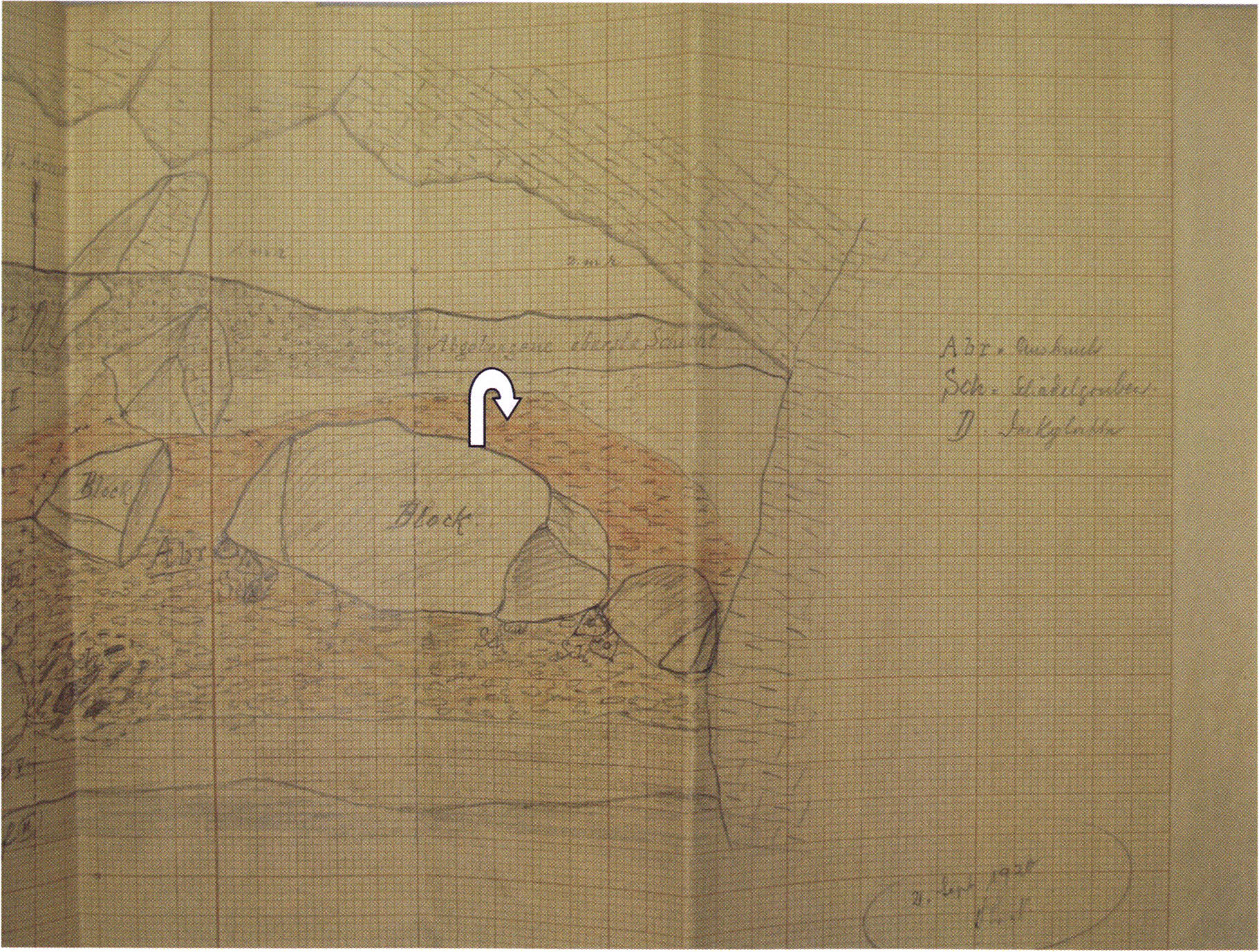 Fig. 168, p. 362: Nigg's cross-section drawing of section 9 in H III (at the point where the 8th longitudinal-axis metre ends and the 9th begins) of 26 July 1923 — D V/6 sketchbook II, p. 8. The block drawn in the foreground at axis height and slightly to the left of it appears already — larger — in the section 8 drawing; behind it, lying somewhat higher, a further, thicker block situated mainly in section 9 and still touching section 10. Both blocks together with further slabs in the 8th and partly 9th section metres formed the niche — see Fig. 164!