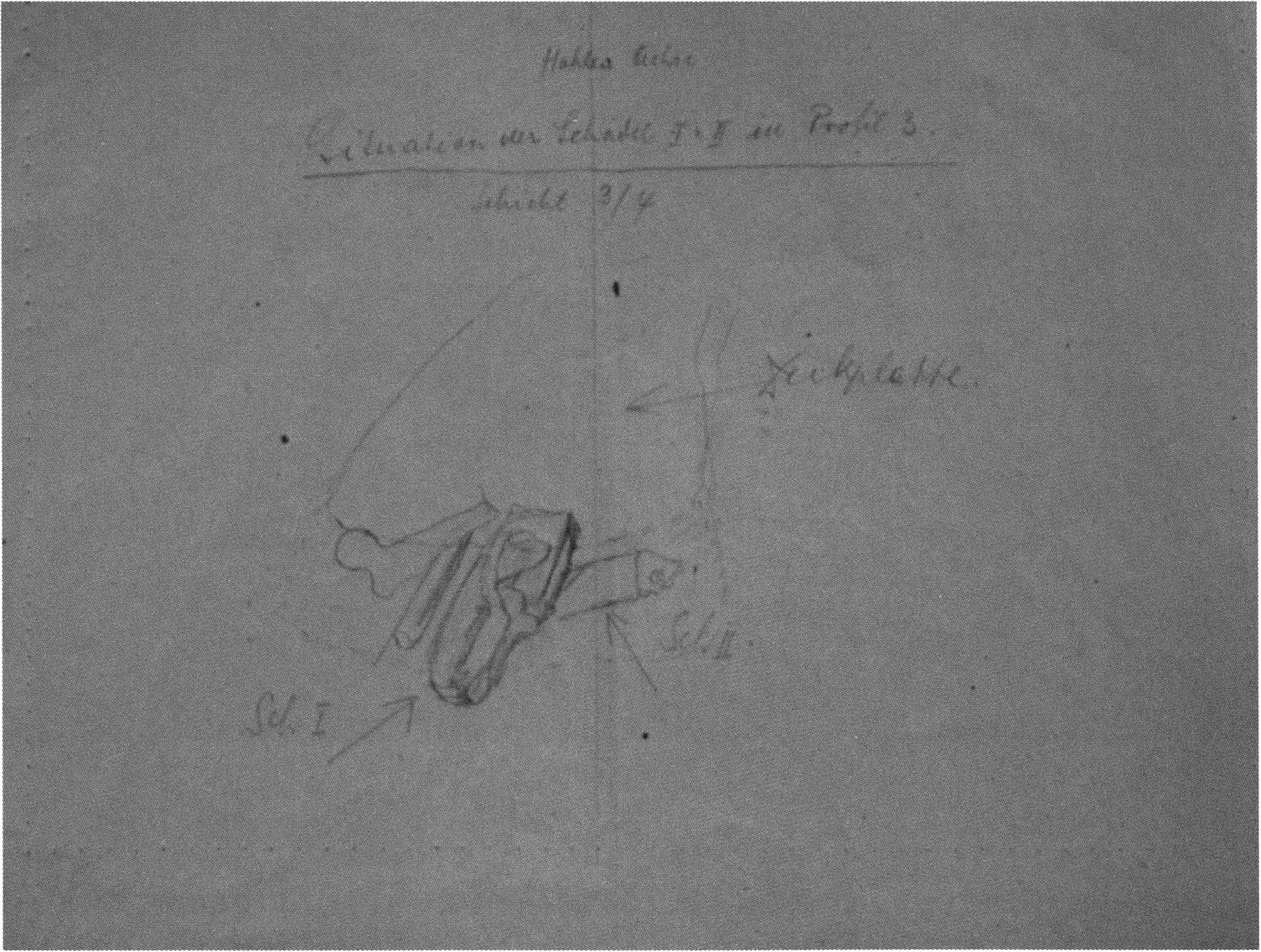 Fig. 143, p. 304: Bächler sketched on 10 August 1921 on a single sheet the situation at the left zygomatic arch with the thigh bone (femur) drawn through it — on the skull from H III metre 0–1, 2nd m left, 3rd/4th layer (= "D 7," cf. p. 301). The end of the femur shows a (artificial) fracture; under the stone slab there were various bone accompaniments: beside ulna and vertebra, two humeri lying slightly offset and parallel above one another — cf. pp. 305 f.!