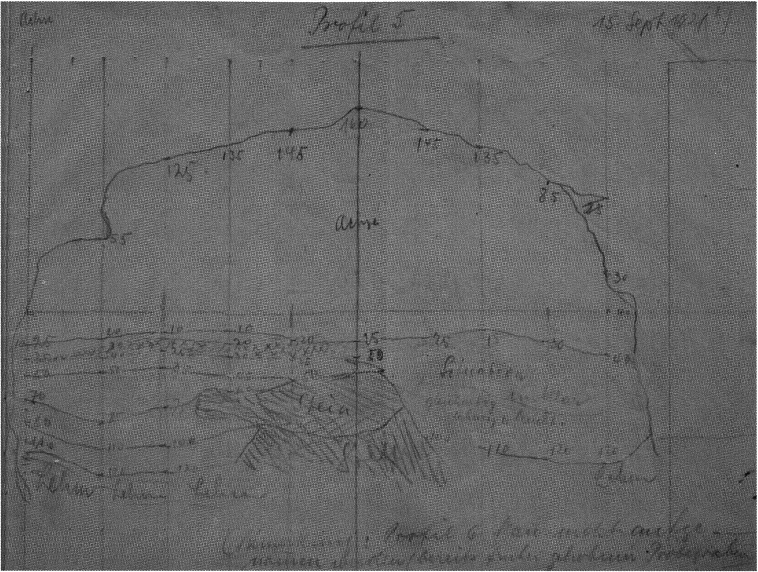 Fig. 155, p. 324: Nigg's half cross-section drawing left of the axis from the 6th section metre (after 5 longitudinal-axis metres) of 15 September 1921 — sketchbook II, p. 5! His crossed-out "note: section 6 cannot be recorded — already-lifted test trench from earlier" is confusing; he leaves the right half of the axis blank and writes "situation unclear." — Nigg will hardly have drawn a cross-section of section 5 on 15 September — after the complete removal of the remainder of the 1919 test trench of H III section 5 on 8 September (see p. 325) — even if it was only the left half of the axis! — Rather, what is here is section 6 left of the axis; the 1919 test trench will still have touched the following section metre 6 on the right side of the axis — which is why Nigg had to write "situation unclear"! — Accordingly the indication "section 5" above the drawing — which moreover, judging from the erasure marks, had been corrected — is wrong!