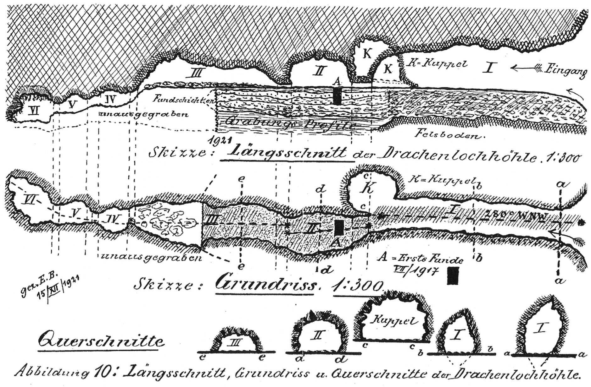 Fig. 156, p. 324: Bächler's sketches of floor plan and elevation of the cave sections together with cross-sections — published as the 10th illustration in the 57th volume of the Yearbook of the St. Gallen Natural History Society for the association years 1920/21 — drawn according to the signature below on 15 December 1921 and recorded in a first, no-longer-preserved sketch on 13 September 1921 — cf. Bächler 1921, p. 60.