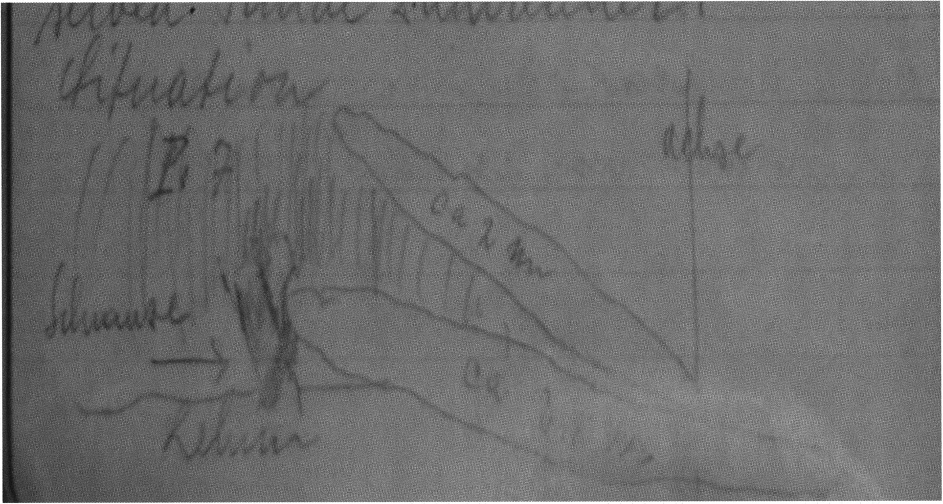 Fig. 172, p. 370: RECORD NIGG book 1923 with a sketch on p. 22 — relating once more and somewhat more precisely — this time without the skull — to the position of the slabs around the skull in depot I, H III section metre 9, 1st m left of the axis, 2nd layer; a further, smaller sketch below it on the same page relating to the position of this depot; and a sketch on p. 23 of the situation of the second skull depot in the 1st m left of the axis, section metre 9 of H III, 40 cm below the surface — at the boundary between layers 2 and 3. — In the second depot Nigg sketches clearly the lateral framing of the skull by platelets — an archaeological find that in the most unambiguous and never refutable manner documents the artificialness — doubted by too many researchers — of the "skull placements" in the Drachenloch!