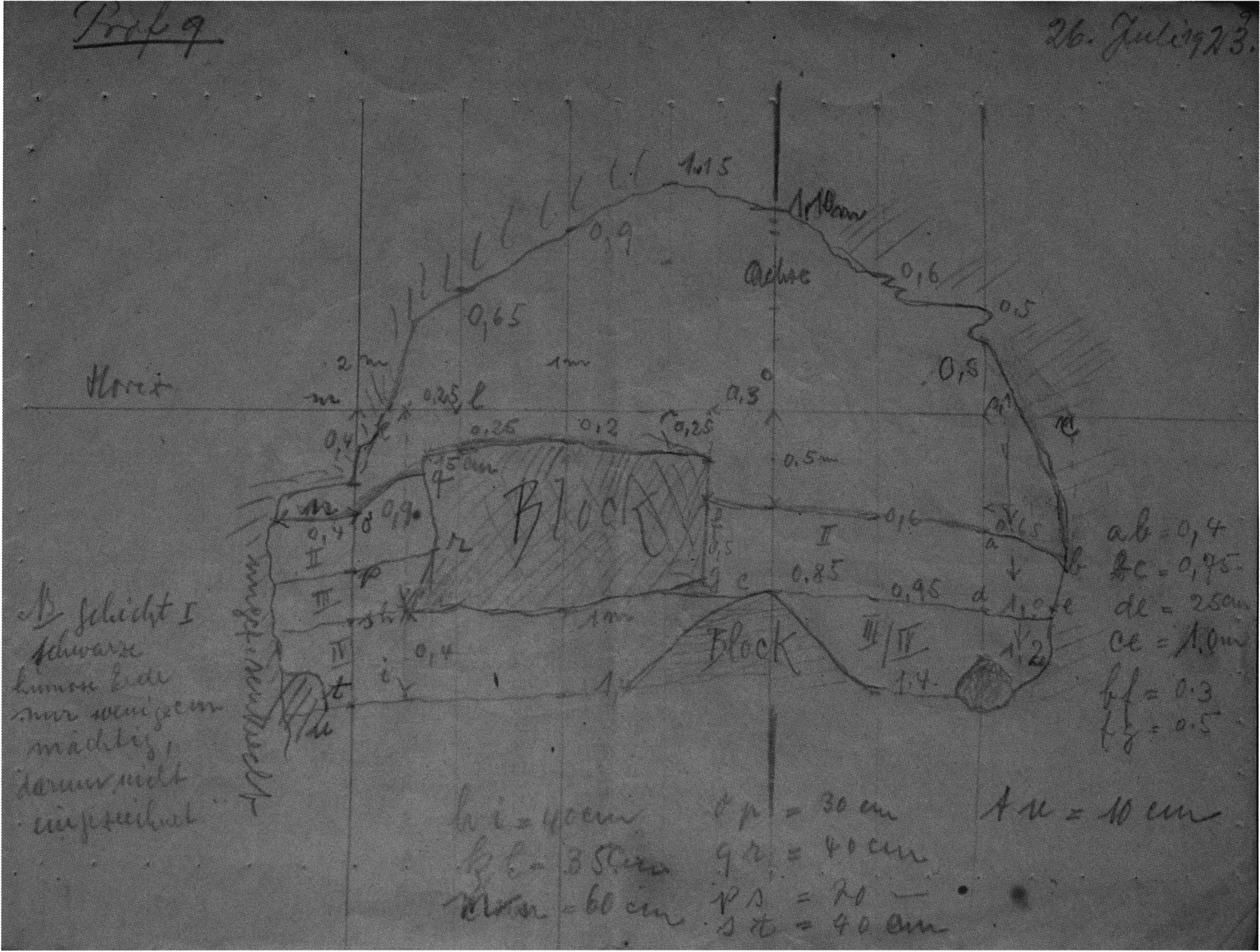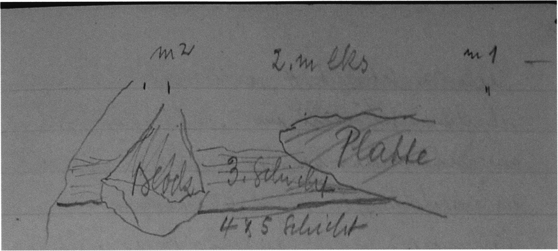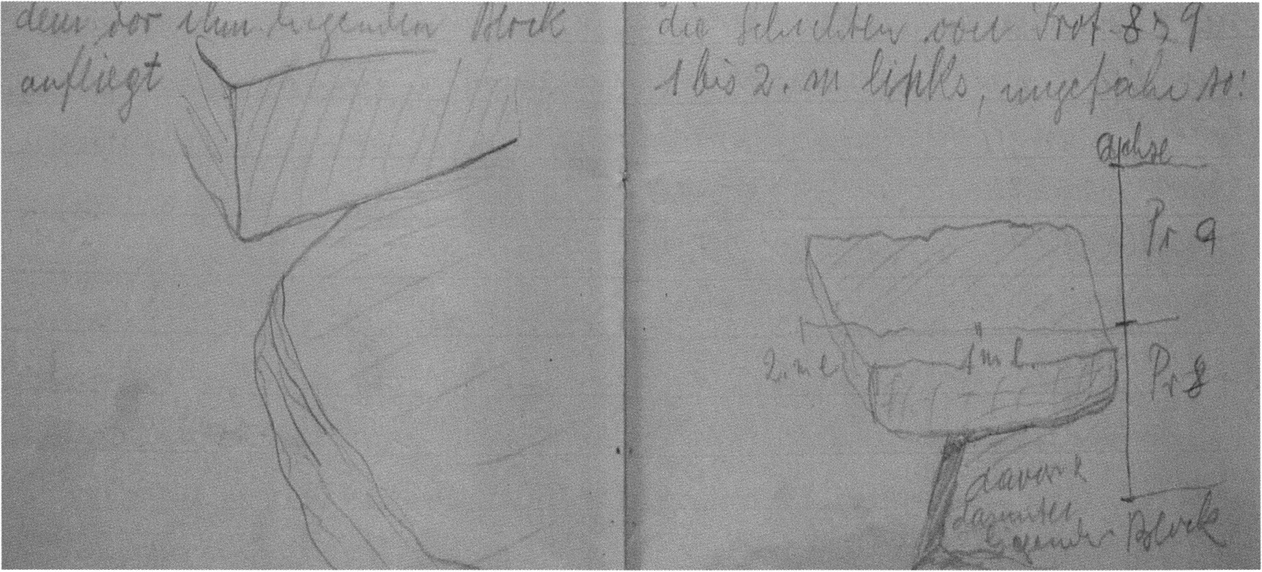 Fig. 162, p. 358: Small sketch by Nigg, 1922 — p. 11 above — of the position of block and slab in the 7th section metre and 2nd m left of the axis, 3rd layer.