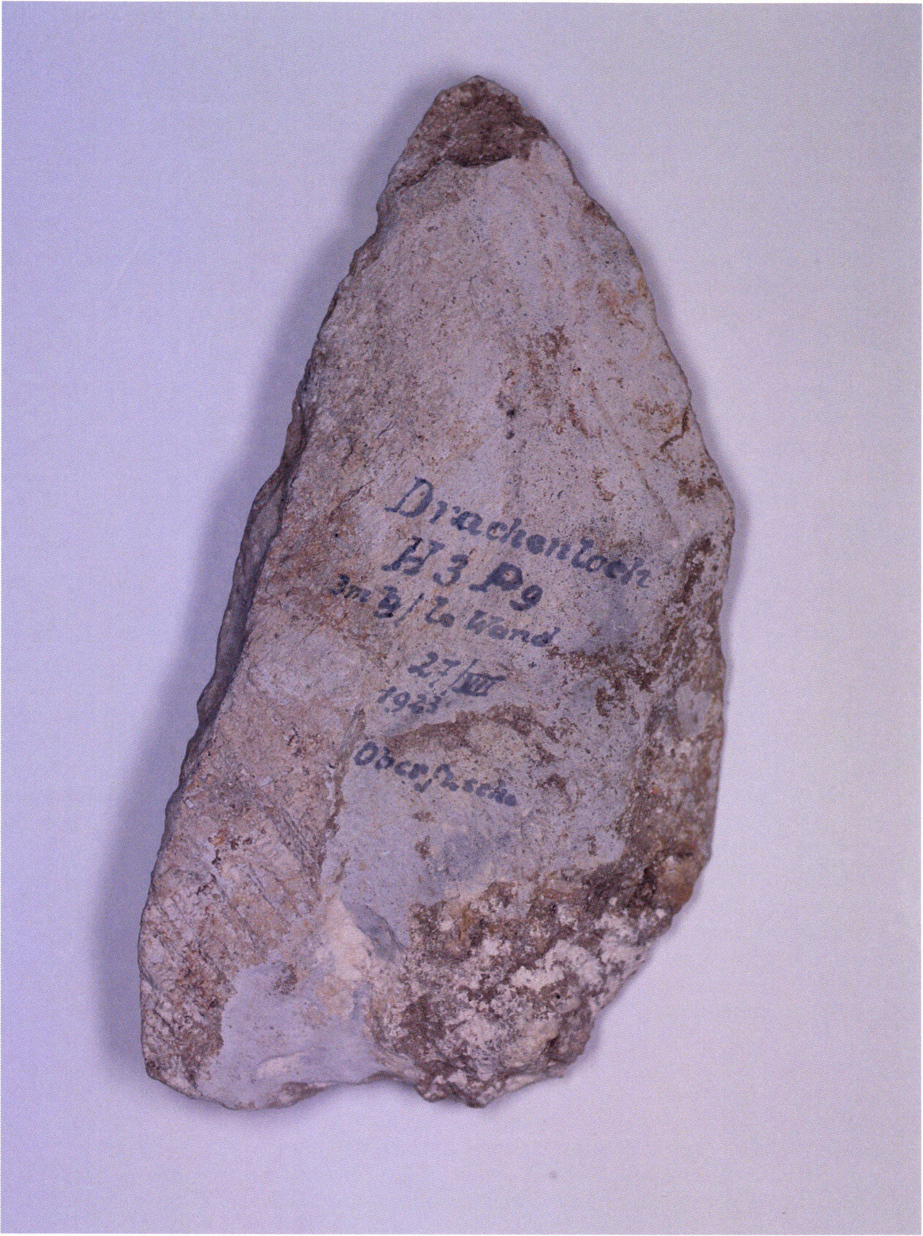 Figs. 169 a/b, pp. 363 f.: In the same east wall cabinet but in a different drawer from the cigar box with the objects of Figs. 165 and 166, there is in a brown cardboard box this "typical Mousterian wedge of Seewerkalk" — illustrated here with front (a) and back (b) — discovered and recorded by Nigg on 27 July 1923 in the 9th section metre at the surface immediately at the left cave wall in the 3rd remainder-metre. The inscription on the front "Drachenloch H 3 section 9 3 m l wall 27/VII/1923 surface" — confirms the identity with this object recorded by Nigg, whose artefact character — even though Nigg writes further down in the record in the customary (over-) cautious manner: " Can be chance — could equally well, since lying beside cave bear bones, also be an artefact" — is clear and indisputable: the cutting edge — clearly visible on the back, Fig. 169 b, right edge! — is still sharp today, as is the point. — The object shows on the front in the lower left corner — clearly visible — parallel arranged, engraved, straight-running grooves that can only derive from human activity! — Particularly noteworthy here is also the fact that the object lay in H III in section metre 9 at the surface — i.e. that at this spot, after the abandonment of the cave by the prehistoric man of Mousterian culture, no soil formation occurred over the object during the subsequent tens of thousands of years!