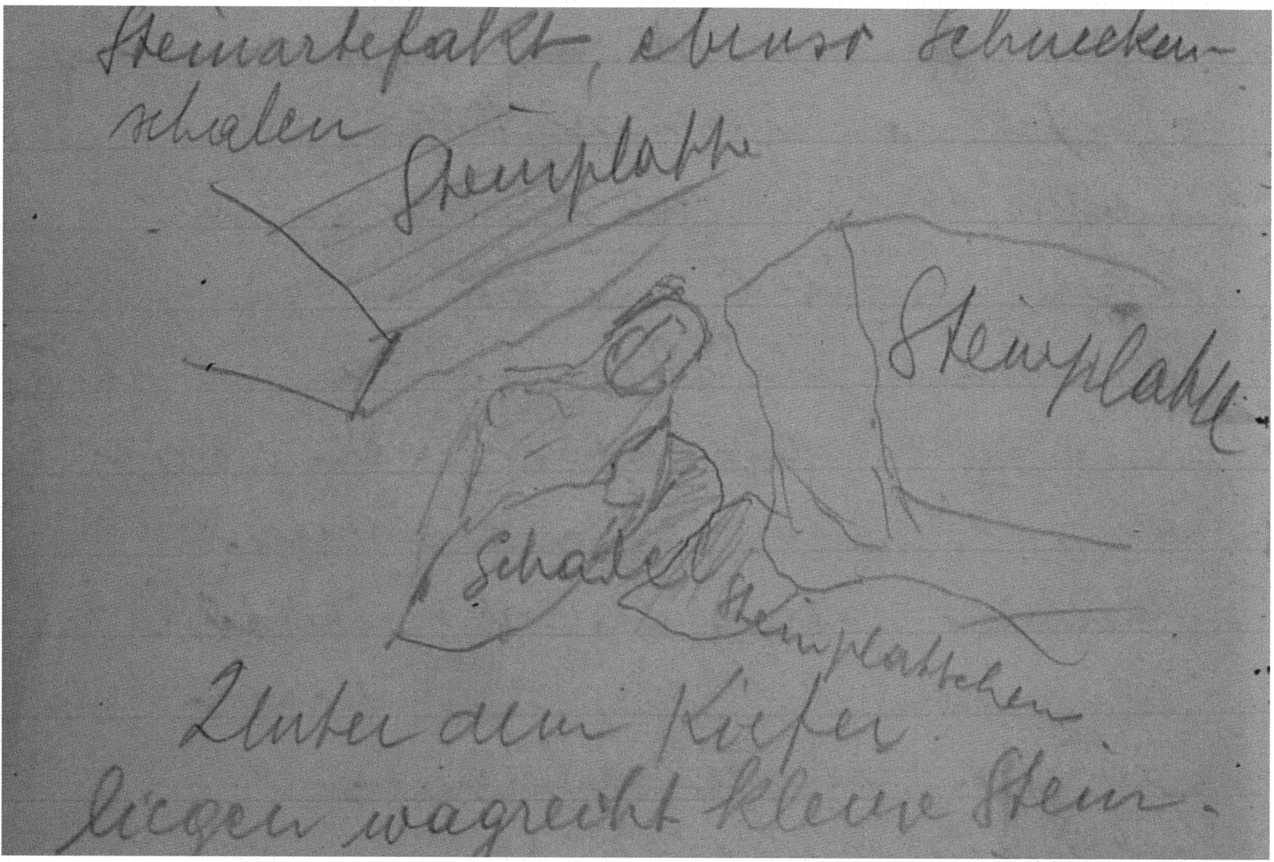 Fig. 175, p. 375: Nigg's sketch, 1923, p. 40, of the skull depot "D 10 on ascending stone slab" from the 2nd m right in the 10th section metre of H III. The skull roof lay 25 cm below the surface — the skull at the boundary to the 11th section metre. Immediately beside its right zygomatic arch there appeared a second (unidentified) skull! The left zygomatic arch of the first skull had only a stump — as Nigg weakly indicates in his sketch here.