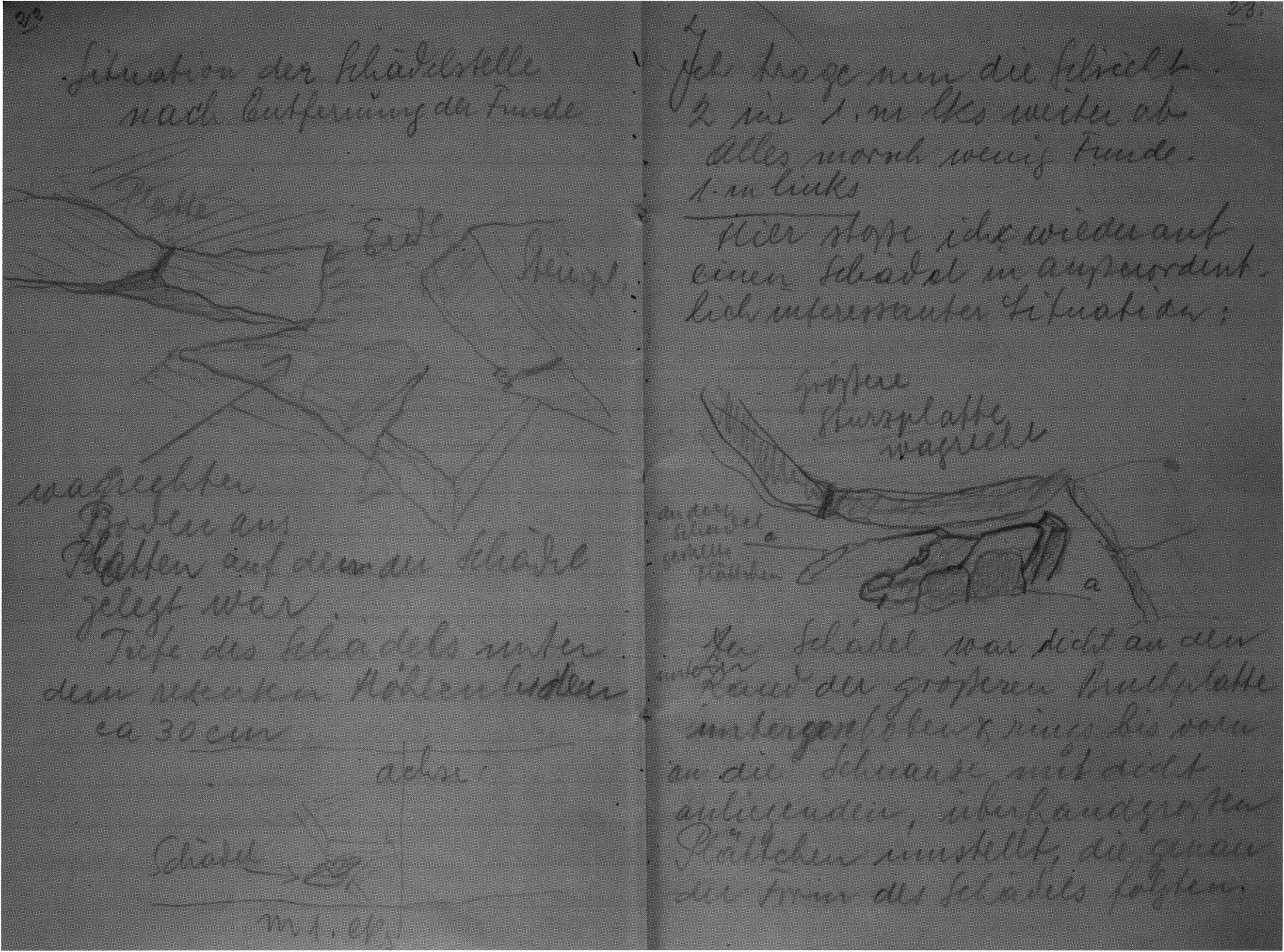 Fig. 146, p. 311: The sketch of the "skull situation" in H III section metre 3, 1st m left and right of the axis — transferred by Nigg from the record book 1921 (5), p. 40, into sketchbook (S) I, p. 3: under a cover slab, a larger skull I complete with the lower jaw, whose occipital crest lies above the muzzle of a second, smaller skull II (= D 13, Fig. 147, pp. 312 ff.).