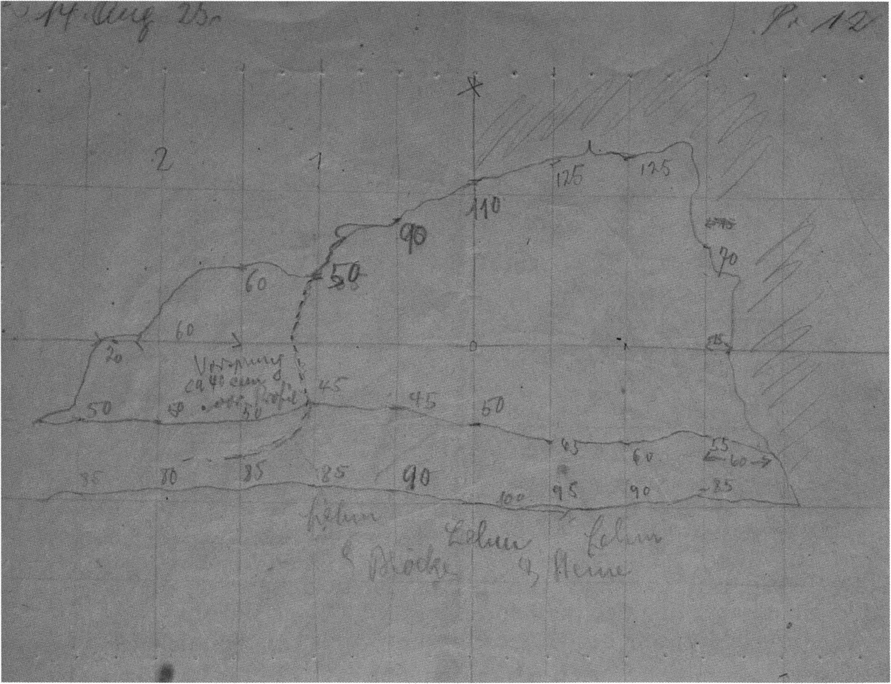 Fig. 180, p. 379: Nigg's last cross-section drawing of the 12th section metre (after 11 longitudinal-axis metres) in the 3rd cave section H III of 14 August 1923; here — as in the preceding sections already — given the tangle of blocks appearing ever more at the surface toward the rear of the 3rd cave section, it was hardly or no longer possible for him to indicate a layering of the floor!