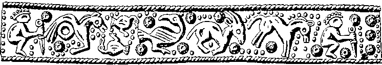 Egentlig inngår dyremotiv blant germanske hersker- og krigersymboler langt tidligere, men da med klar innflytelse fra provinsialromersk kunsthåndverk. På sølvbegrene fra en av de sjællandske Himlingøje-gravene fra første halvdel av 3. årh finnes f.eks. en frise i presset, forgylt sølvblikk under munningsranden (Bok 1, 11-13), jfr. tegning. Frisene er ikke helt identiske men inneholder det samme motivet, nemlig hukende, profilsette krigere som holder et romersk ringknappsverd. Krigerne har hjelm og synes å holde øye med en rekke dyr og fugler i et landskap. Scenene utspiller seg fra venstre mot høyre. Vi kjenner igjen en hest med innbøyde forben og en stor rund knopp under bakparten. Foran hesten står to mindre fugler som nærmest ser ut som ender, deretter en stor fugl med lang hals, krumt nebb og kraftige klør - den eneste som kikker bakover. På det ene begeret finnes dessuten to mannsmasker med lang bart. De er plassert slik at den ene virker som et speilbilde av den andre. Deretter følger en bukk eller gemse, nok en hest og en kriger. Den siste hesten (?) er fremstilt i profil med fire ben i motsetning til de øvrige som bare vises med to ben. Betyr det at den hadde åtte ben? Ingen av dyrene kan derimot klassifiseres som rovdyr, men den store fuglen kan være en stor rovfugl.